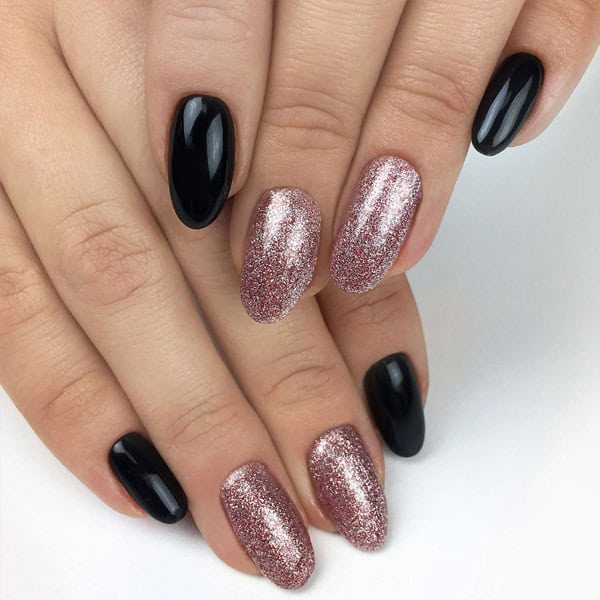 Μείγμα από κόκκινο και ασημί glitter με σκούρο rose gold.