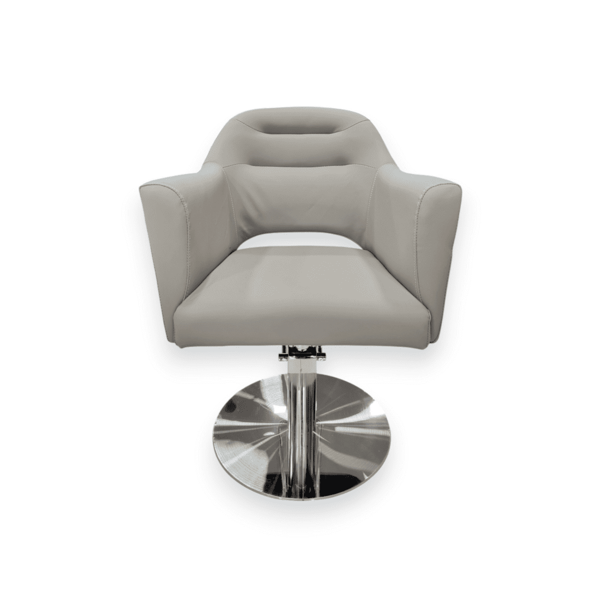 Καρέκλα κομμωτηρίου με μοντέρνο σχεδιασμό, επένδυση σε γκρι δερματίνη και βάση με μηχανισμό για εύκολη ρύθμιση ύψους