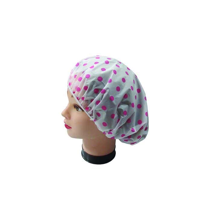 Σκουφάκι μπάνιου σε χρώμα πουά, πλαστικό. Προστατεύει τα μαλλιά από την υγρασία και το νερό κατά τη διάρκεια του ντουζ.