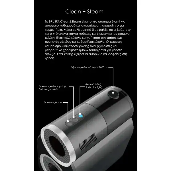 Ο αποστειρωτής και καθαριστής βουρτσών Clean & Steam είναι μια απαραίτητη συσκευή για κομμωτήρια και barber shops, σχεδιασμένη για γρήγορο και υγιεινό καθαρισμό βουρτσών και χτενών.