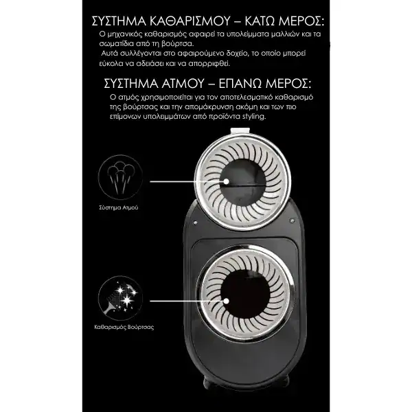 Διαθέτει σύστημα καθαρισμού 2 σε 1 με δύο λειτουργίες: η κάτω υποδοχή αφαιρεί τις τρίχες από τις βούρτσες μέσω περιστρεφόμενου κυλίνδρου, ενώ η επάνω υποδοχή απολυμαίνει με καυτό ατμό. Σε μόλις 1–3 λεπτά, οι βούρτσες είναι καθαρές και έτοιμες για τον επόμενο πελάτη.