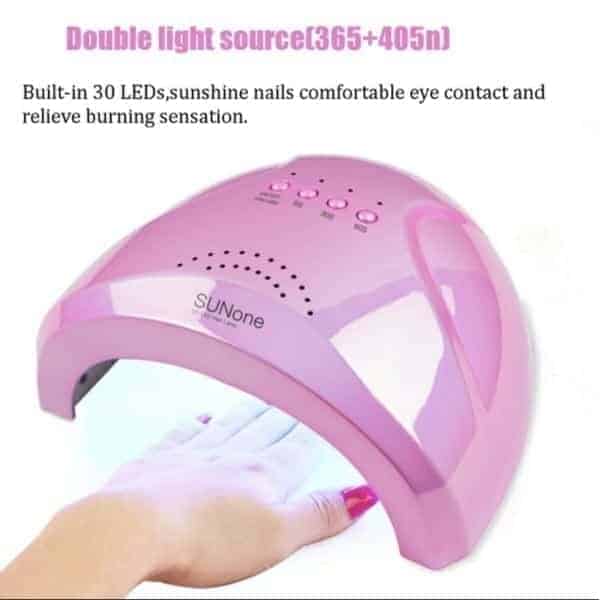 Επαγγελματική Led UV Lamp Sunone 48 Watt ενός χεριού με διπλό μήκος κύματος (365 & 405 nm) και ανακλαστήρες για τον άψογο πολυμερισμό του gel (UV & LED gels) σε όλη την επιφάνεια του νυχιού. Διαθέτει αισθητήρα αφής ώστε να ανάβει αυτόματα με την εισαγωγή του χεριού και επιλογή χρόνου (5/30/60 sec). Sun light φωτισμός για προστασία των ματιών.