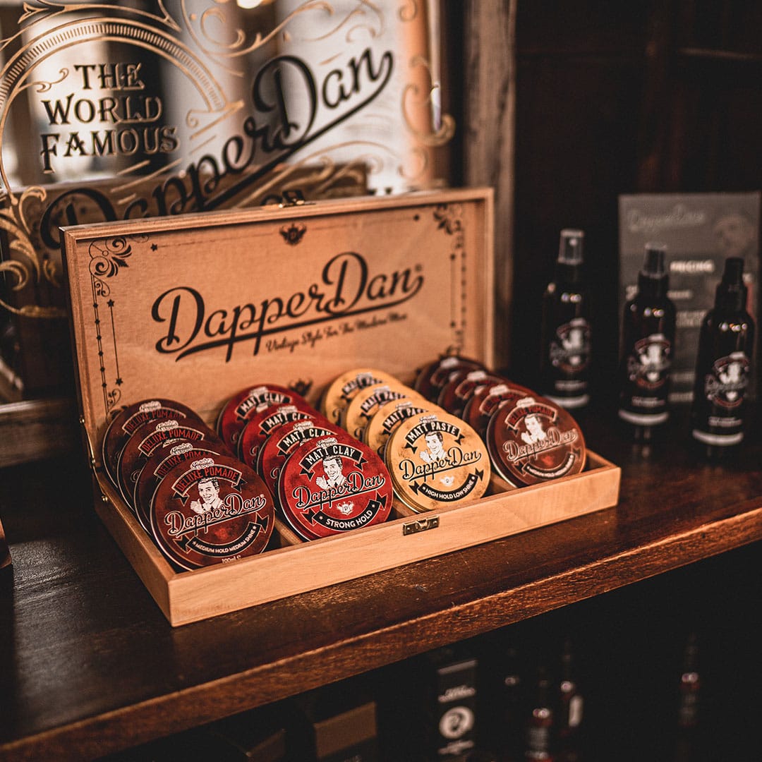 - Ξύλινο κουτί τοποθέτησης των προϊόντων Dapper Dan για barbershops