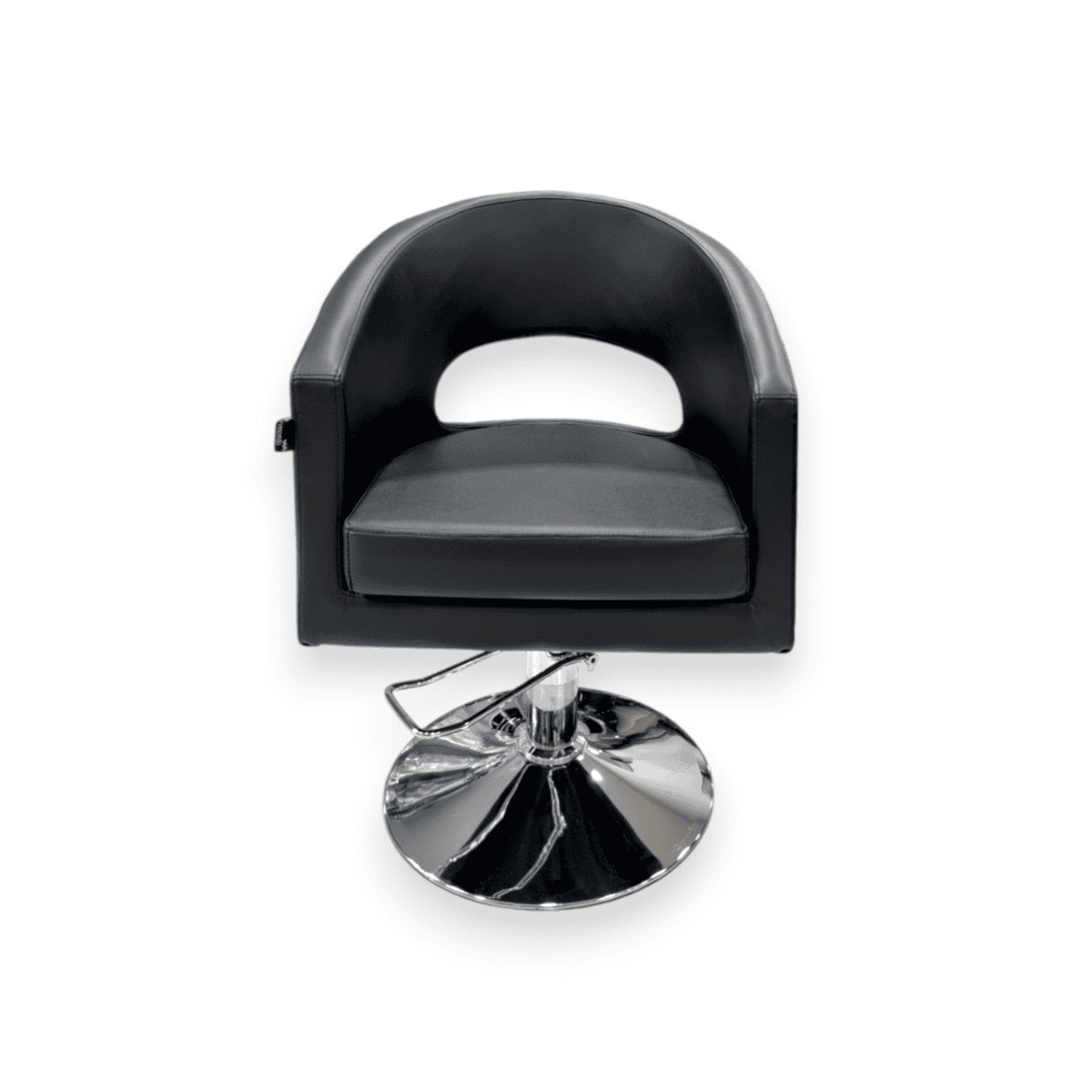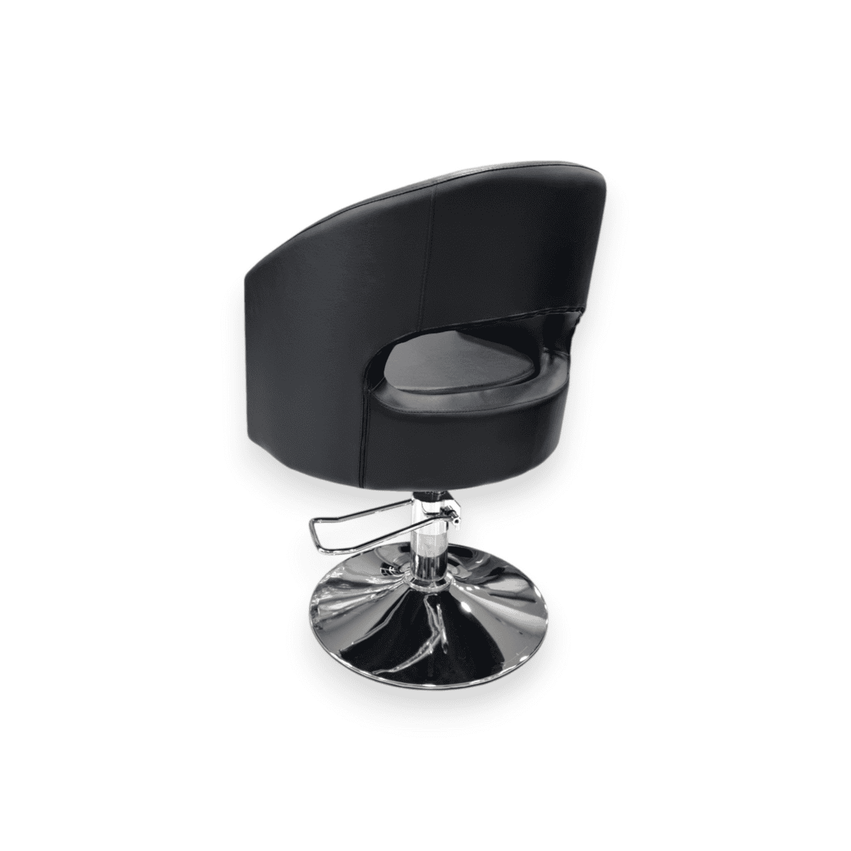 Καρέκλα κομμωτηρίου με κομψό καμπυλωτό σχεδιασμό, επενδυμένη με μαύρη δερματίνη και βάση με μηχανισμό για ρύθμιση ύψους