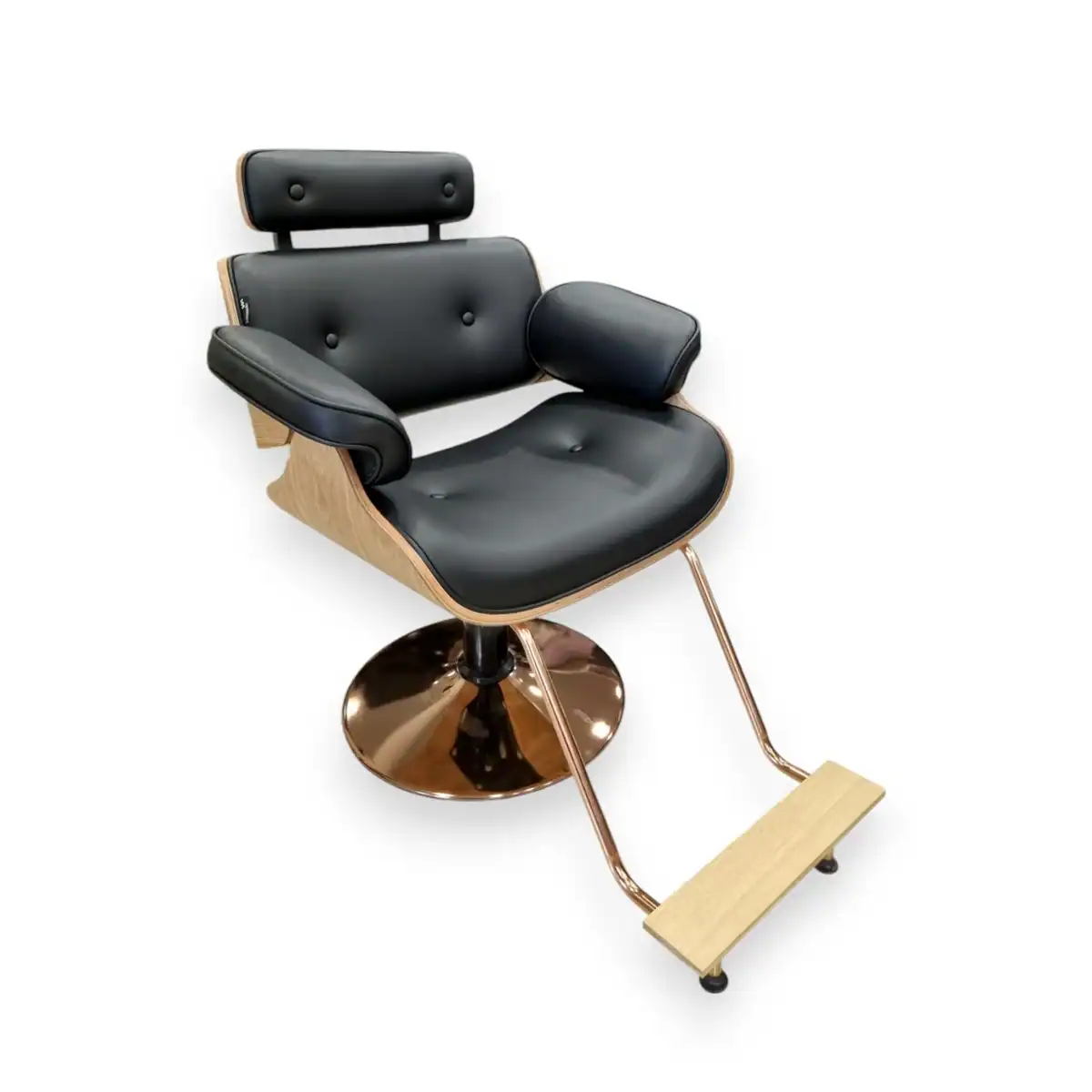 Κομψή καρέκλα κομμωτηρίου με ξύλινη λεπτομέρεια, μαξιλάρια για άνεση και υποπόδιο, ιδανική για μοντέρνους χώρους