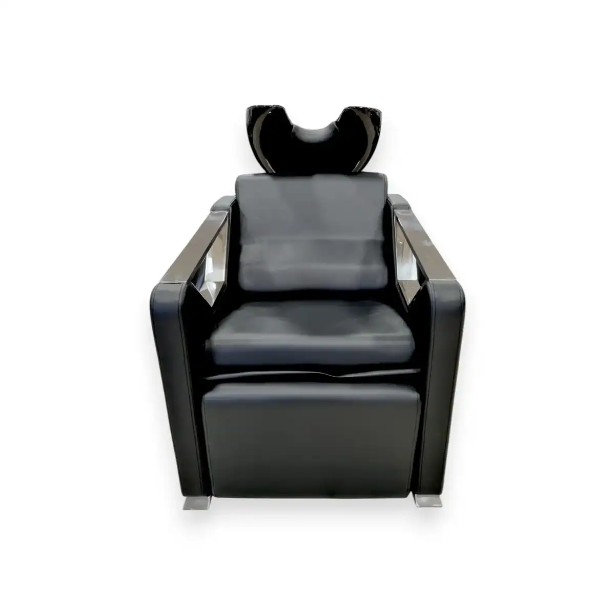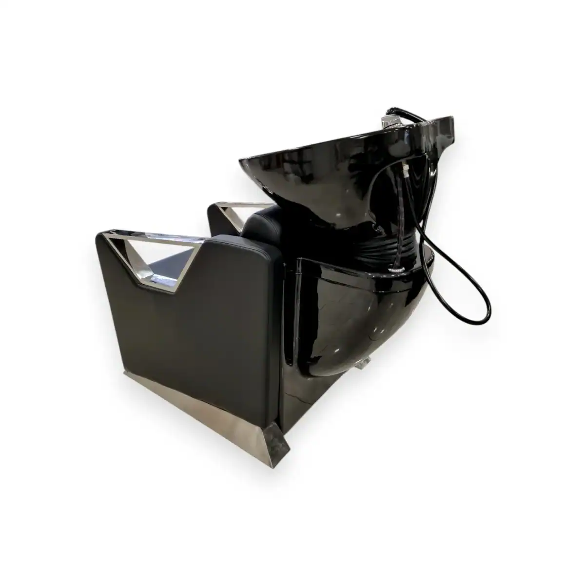 Μοντέρνος λουτήρας κομμωτηρίου με λουτήρα από μαύρη πορσελάνη και άνετο δερμάτινο κάθισμα, ιδανικός για επαγγελματική χρήση