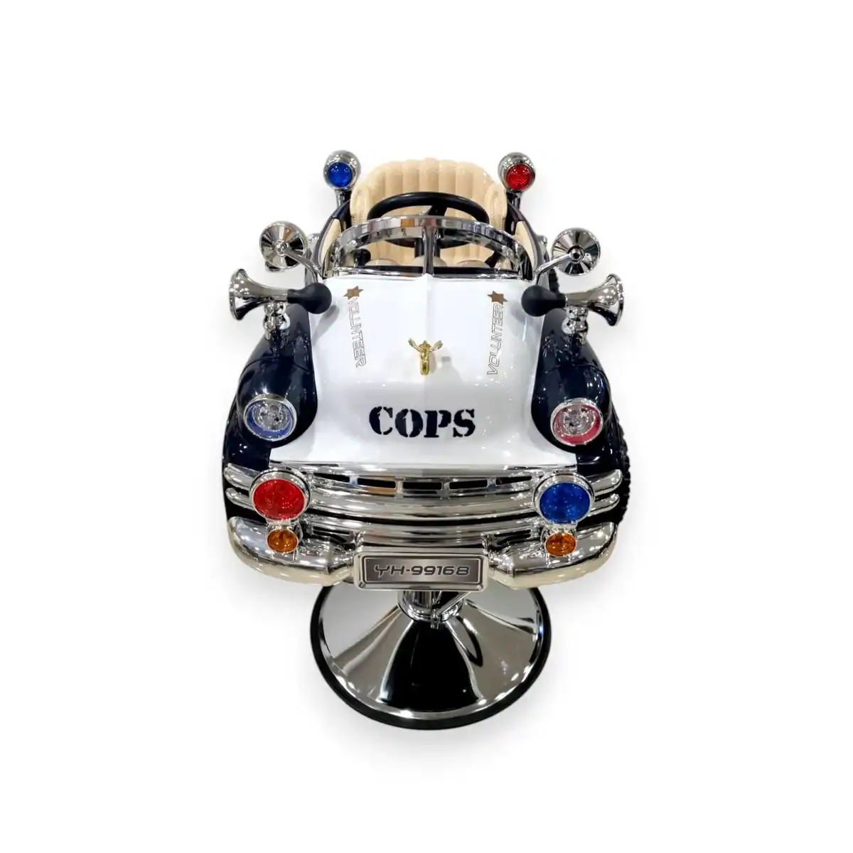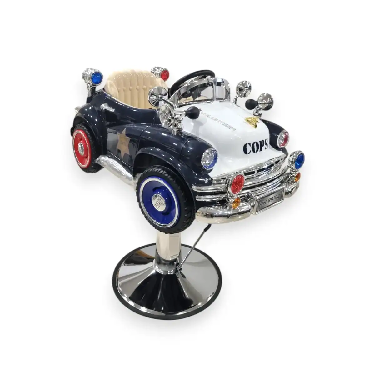 Παιδικό κάθισμα κομμωτηρίου σε σχήμα περιπολικού, με διασκεδαστικό σχεδιασμό για να κάνει το κούρεμα πιο ευχάριστο για τα παιδιά. Άνετο και πολύ διασκεδαστικό!