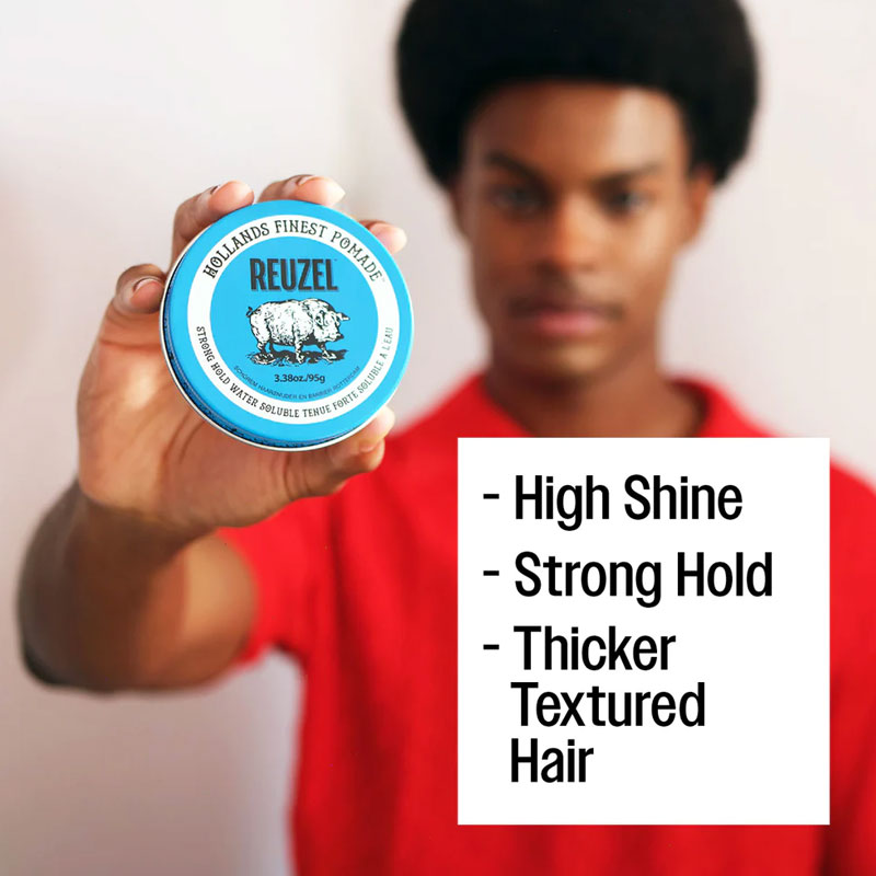 Η Reuzel Blue Pomade είναι μια πομάδα με βάση το νερό, σχεδιασμένη για ισχυρό κράτημα και έντονη λάμψη. Προσφέρει ευέλικτο και σταθερό αποτέλεσμα που διατηρεί το χτένισμα στη θέση του όλη μέρα, χωρίς να σκληραίνει τα μαλλιά. Ξεβγάζεται εύκολα μόνο με νερό και είναι κατάλληλη για όλους τους τύπους μαλλιών που χρειάζονται αυξημένη σταθερότητα στο styling.