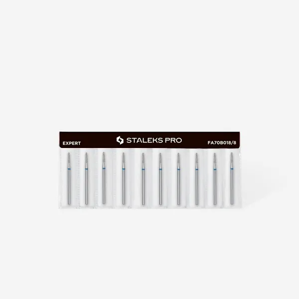 Ένα εργαλείο υψηλής ακρίβειας από τη σειρά EXPERT της STALEKS, με διάμετρο κεφαλής 1,8 mm, εργαζόμενο μέρος 8 mm, μπλέ εγκοπή – μέτρια σκληρότητα και σχήμα κομμένου κώνου. Η κεφαλή είναι ιδανική για εργασία με φυσικές και τεχνητές επιφάνειες, διαμόρφωση του αναπτυσσόμενου μέρους της πλάκας του νυχιού και λείανση της επιφάνειας, προσφέροντας εξαιρετική απόδοση τόσο για αρχάριους όσο και για έμπειρους τεχνικούς. Το σχήμα του «κομμένου κώνου» το καθιστά κατάλληλο για επεξεργασία των νυχιών όπως και των επεκτάσεων τους , χωρίς κίνδυνο τραυματισμού